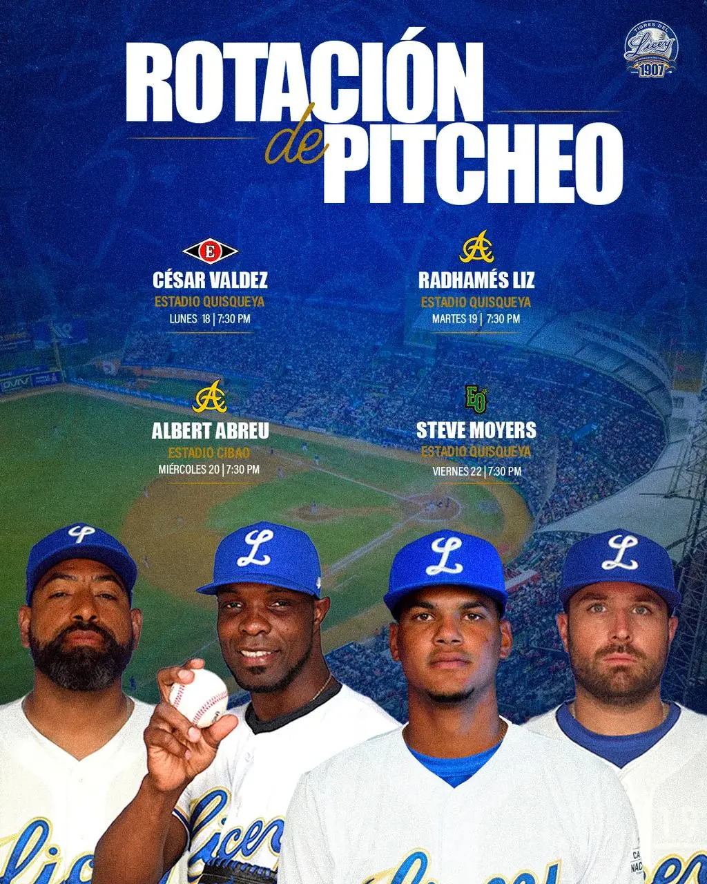 El veterano Radhamés Liz (2-0) será el encargado de subir a la lomita el martes ante las Águilas Cibaeñas en el Quisqueya Juan Marichal desde las 7:30 de la noche. Solo ha permitido una carrera limpia en 18 entradas para un porcentaje de carreras limpias de 0.50. Su WHIP es de 0.72.