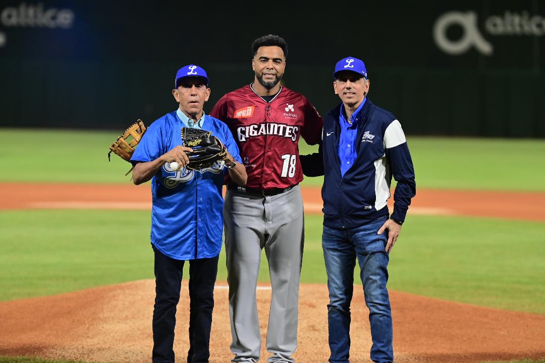 El presidente de Licey, Ricardo Ravelo, el Dr. Antonio Cruz Jiminián, Alfredo Acebal Rizek, presidente de los Gigantes del Cibao, acompañaron al estelar jugador de Grandes Ligas, Nelson Cruz, en su despedida en el coloso del ensanche La Fe, a recibir una placa con un resumen de sus logros en el béisbol de MLB.