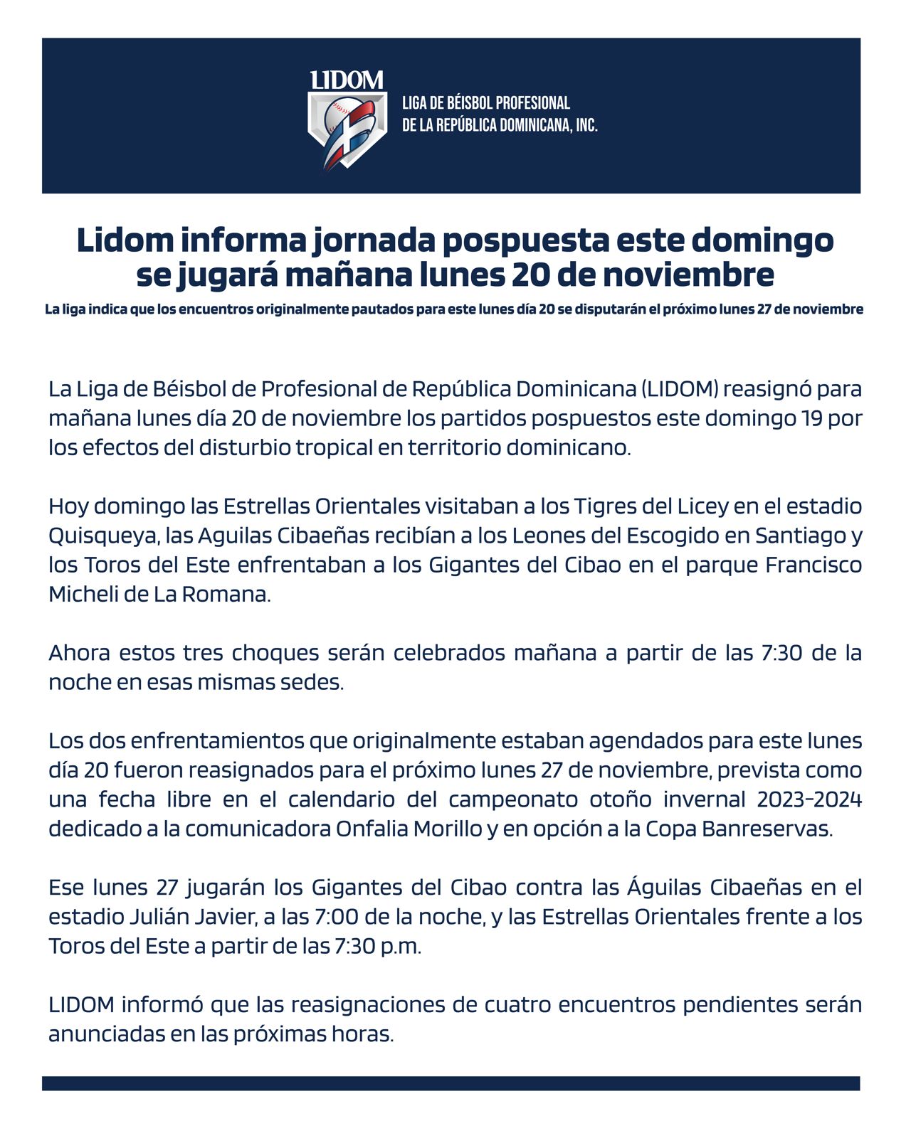 LIDOM informa jornada pospuesta este domingo se jugará mañana lunes 20 de noviembre