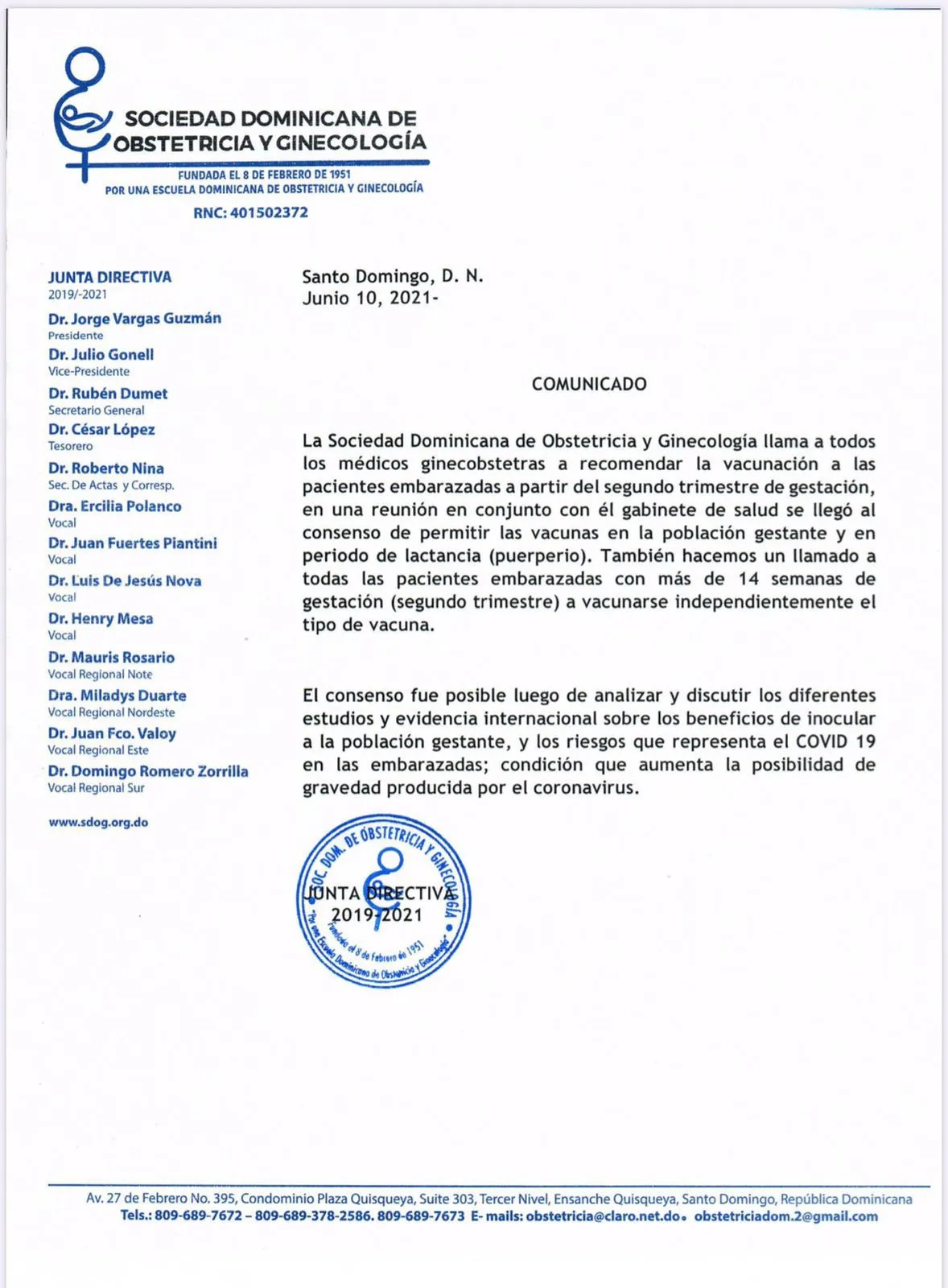 SANTO DOMINGO.- La Sociedad Dominicana de Obstetricia y Ginecología llama a todos los médicos ginecobstetras a recomendar la vacunación a las pacientes embarazadas a partir del segundo trimestre de generación, en una reunión en conjunto con el gabinete de salud se llegó al consenso de permitir las vacunas en la población gestante y en periodo de lactancia (puerperio).