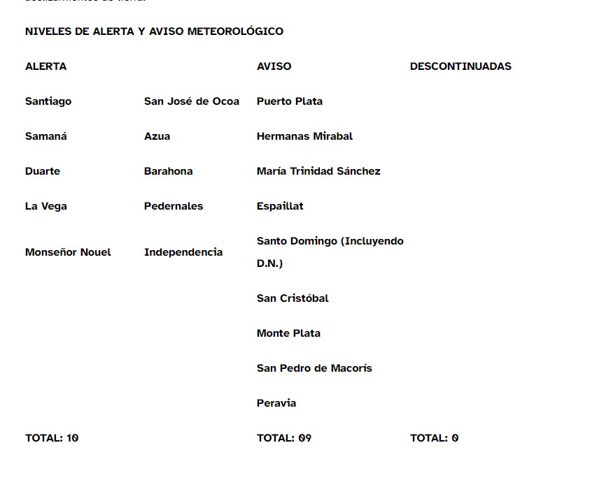 El informe del tiempo indica ambos mantendrán las condiciones favorables para que durante el día sigan ocurriendo precipitaciones, especialmente sobre las provincias del litoral costero Caribeño, noroeste, noreste, suroeste, cordillera Central y la zona fronteriza, como son: Pedernales, Barahona, Azua, San Juan, Peravia, Sánchez Ramírez, La Vega, Monseñor Nouel, Monte Cristi, Dajabon, Santiago Rodríguez, Puerto Plata, San Cristóbal, San José de Ocoa, La Romana, San Pedro de Macorís, El Seibo, Hato Mayor, Samaná, La Altagracia y El Gran Santo Domingo (Incluyendo D.N.).