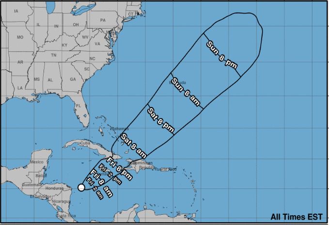 En la trayectoria pronosticada, se espera que el centro del sistema se mueva a través de Jamaica tarde el viernes, el sureste de Cuba temprano El sábado, y el sureste de las Bahamas y las Islas Turcas y