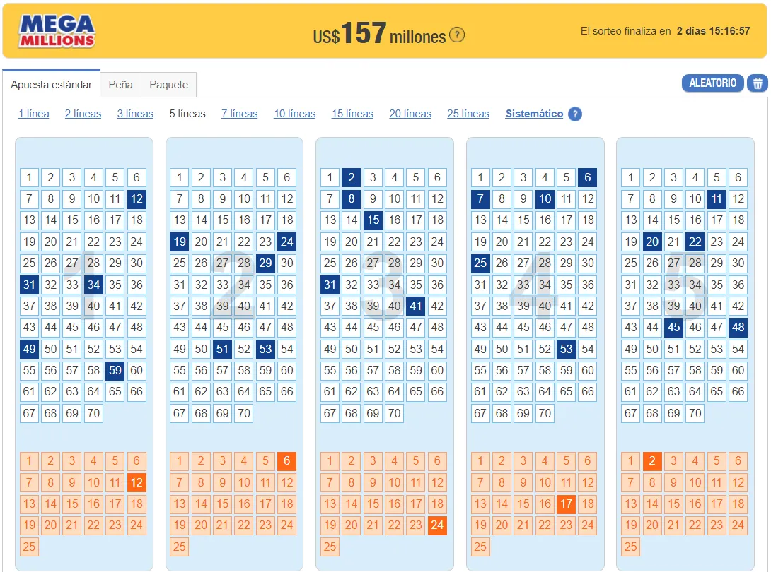 Entra en la página del Mega Millions en TheLotter y elige tus números de la suerte: cinco números principales y un número adicional.
