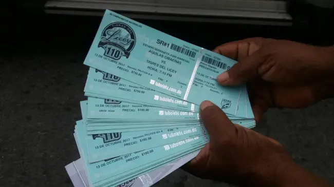 Según denuncias las boletas del juego entre Águilas y Tigres de este martes se comercializaron en el mercado negro a los siguientes precios; las boletas correspondientes a bleachers que cuestan RD$200 en boletería eran vendidas a RD$1,000, las de preferencia de RD$400 a RD$2,500, palcos AA de RD$ 800 a RD$3,000 y las de A de RD$1,000 llegaron a costar hasta RD$5,000.