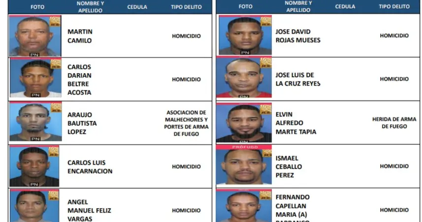 En el grupo de los 10 más buscados por homicidios figuran Martín Camilo, José David Rojas Mueses, Carlos Darian Beltré Acosta, José Luis de la Cruz Reyes, Araujo Bautista López, Elvin Alfredo Marte Tapia, Carlos Luis Encarnación, Ismael Ceballo Pérez, Ángel Manuel Vargas y Fernando Capellán María (a) Barranco, quienes son señalados por su presunta vinculación con hechos violentos ocurridos en distintas demarcaciones del país.