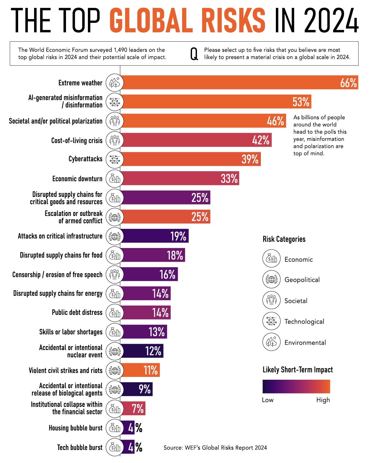Estos datos surgen de la encuesta anual del Foro Económico Mundial a líderes de todo el mundo, según una encuesta realizada a 1,490 líderes. Se pidió a los líderes que eligieran hasta cinco riesgos que probablemente presenten una crisis material a escala global en 2024.