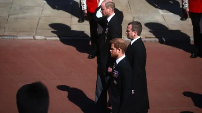 Los hermanos participaron en la procesión que siguió al féretro de su abuelo, pero no lo hicieron juntos, ya que entre ellos se situó su primo Peter Phillips, hijo de la princesa Ana de Inglaterra. Posteriormente, entraron en la capilla uno detrás del otro.