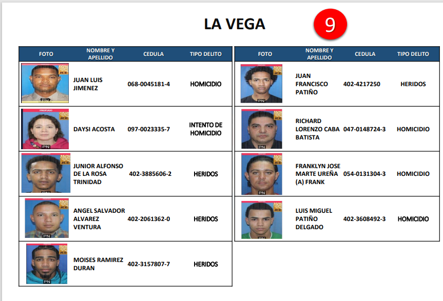 La Vega.– LA VEGA.- La Policía Nacional de la República Dominicana, a través de su Dirección Central de Investigación (DICRIM), publicó recientemente una lista de los nueve prófugos más buscados en la provincia de La Vega.