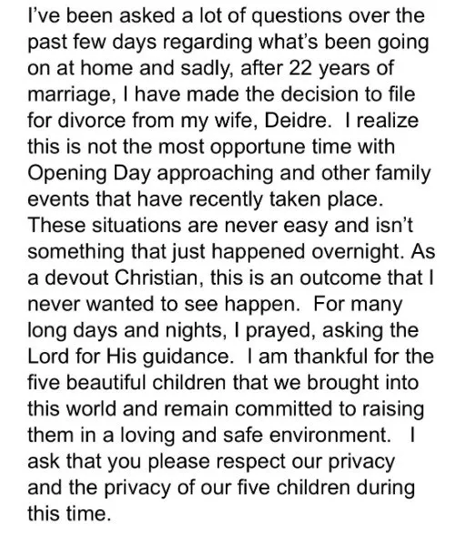 "Tristemente luego de 22 años de casados he tomado la decisión de pedirle el divorcio a mi esposa Deidre. Entiendo que este no es el mejor momento para una noticia como esta, especialmente con el Opening Day tan cerca y teniendo en cuenta otros aspectos que han sucedido recientemente. Decisiones como esta no se toman de la noche a la mañana y este es un desenlace que nunca quise que sucediera", fueron algunas de las palabras de Pujols en su comunicado.
