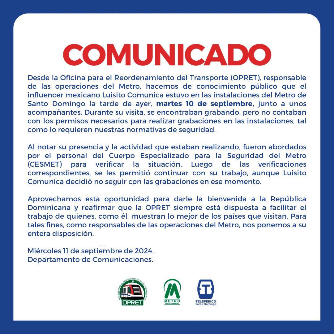 Aprovechamos esta oportunidad para darle la bienvenida a la República Dominicana y reafirmar que la OPRET siempre está dispuesta a facilitar el trabajo de quienes, como él, muestran lo mejor de los países que visitan. Para tales fines, como responsables de las operaciones del Metro, nos ponemos a su entera disposición", dice el comunicado.