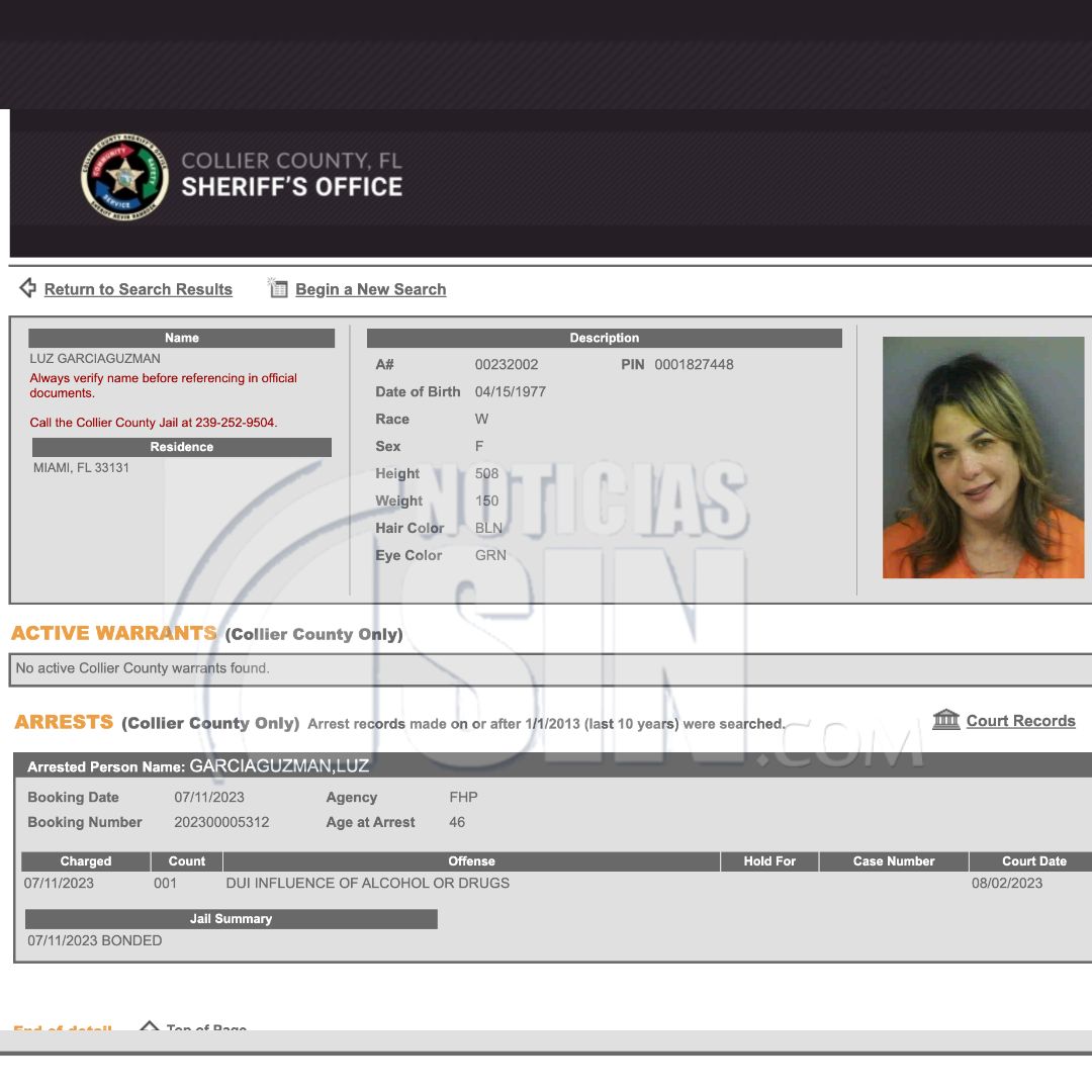 Santo Domingo.– SANTO DOMINGO.- La presentadora de televisión Luz García podría enfrentar cargos de hasta seis meses de cárcel y una multa de entre 500 y 1,000 dólares, luego de ser detenida y procesada por la policía en la Florida por conducir supuestamente bajo los efectos de alcohol y otras sustancias, según establece el sitio web de la Oficina del Sheriff del Condado de Collier, ubicado en el suroeste del estado de Florida.