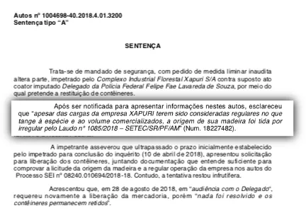 Contactado, Complexo Industrial Florestal Xapuri dijo a través de su oficina de prensa que los cinco contenedores confiscados en la Operación Arquimedes ya fueron devueltos a la compañía por determinación del juzgado federal en Amazonas.