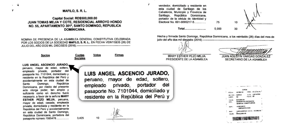 No obstante, los documentos oficiales dicen otra cosa. Primero, que Ascencio sí es accionista mayoritario de Mafilo. Y segundo, que desde su creación Mafilo importó a República Dominicana casi 1.425 toneladas de madera por un valor FOB de 1.170.285 dólares que le envió Inversiones La Oroza desde Perú, lo cual representa una séptima parte de todas sus importaciones.