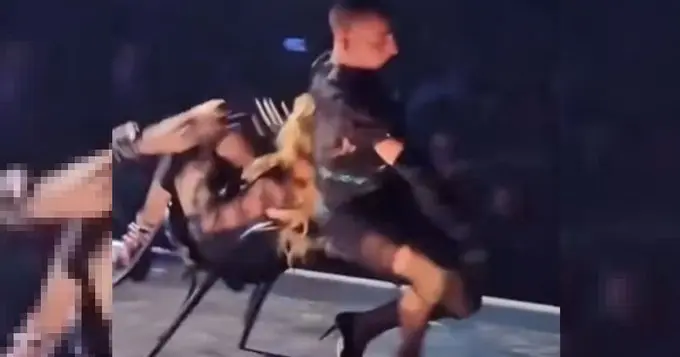 El incidente se produjo cuando la leyenda del pop, de 65 años, se sentó en una silla durante su interpretación de 'Open Your Heart', y un bailarín intentó entonces arrastrarla por una larga sección del escenario. Sin embargo, la coreografía fracasó cuando el bailarín perdió aparentemente el control de la silla, haciendo que ambos cayeran de espaldas.