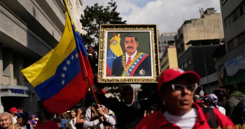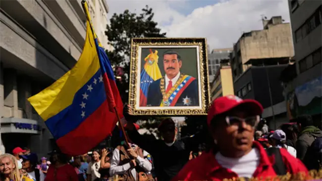 Con carteles que reclamaban la puesta en libertad de Maduro y su esposa Cilia Flores, ambos recluidos en una cárcel de Nueva York.