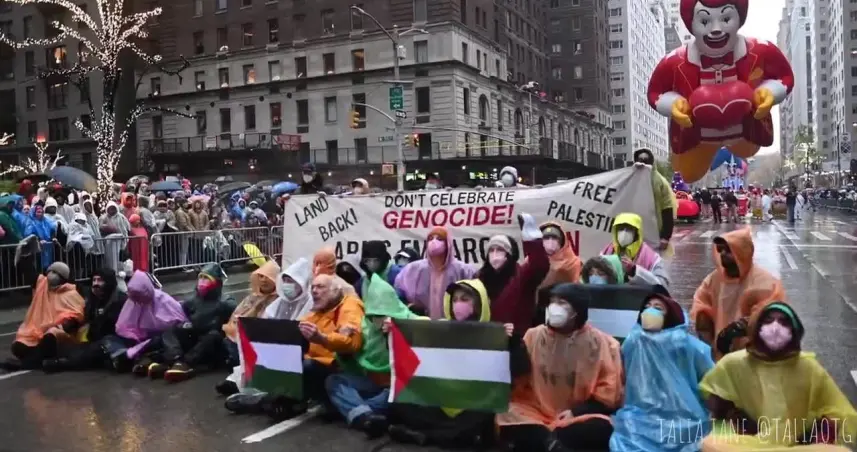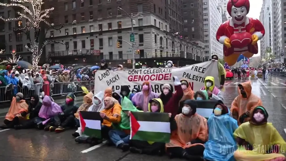 En Nueva York, los manifestantes ingresaron a la ruta del desfile en W. 55th Street y Sixth Avenue, bloqueando temporalmente el paso del emblemático globo de Ronald McDonald. Portando una pancarta que decía "¡No celebren el genocidio!" y gritando "¡Palestina libre, libre!", el grupo detuvo la marcha del evento, provocando abucheos de los asistentes.