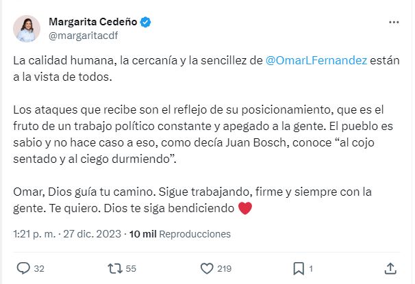 “Omar, Dios guía tu camino. Sigue trabajando, firme y siempre con la gente. Te quiero. Dios te siga bendiciendo”, escribió Cedeño en su cuenta personal en la red social X (antiguo Twitter).