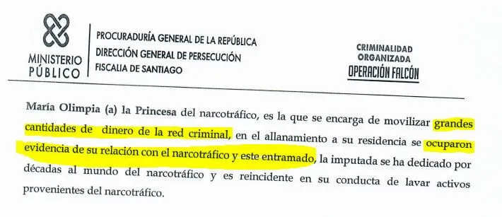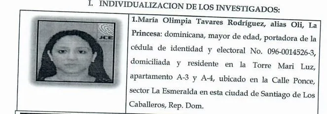 SANTO DOMINGO.- De acuerdo a la solicitud de medida de coerción del entramado denominado Operación Falcón, la imputada María Olimpia Tavares Rodríguez, alias Oli o La Princesa, es la encargada de movilizar grandes cantidades de dinero en esta red criminal.