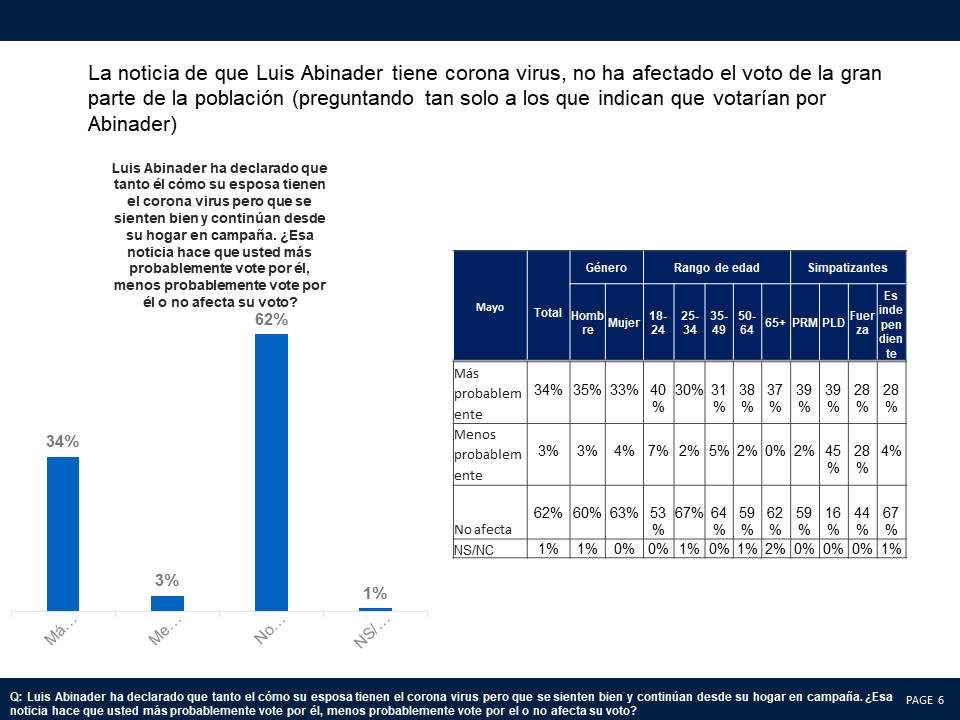 Un 62% de los que previamente habían declarado que votarían por Luis Abinader manifestó que la noticia sobre su problema con el corona virus no va a afectar su voto, pero un 34% indicó que más probablemente votaría por él ante esa situación. Entre los que indicaron que no votarían por Abinader, un 84% dijo que la noticia sobre el virus y el candidato no influyó sobre su decisión de indicar que no votaría por él.