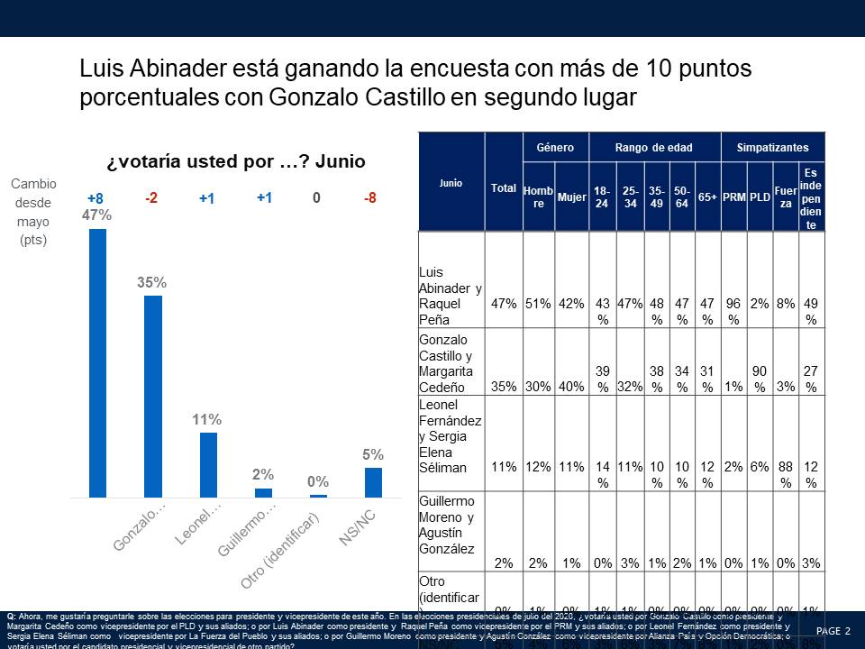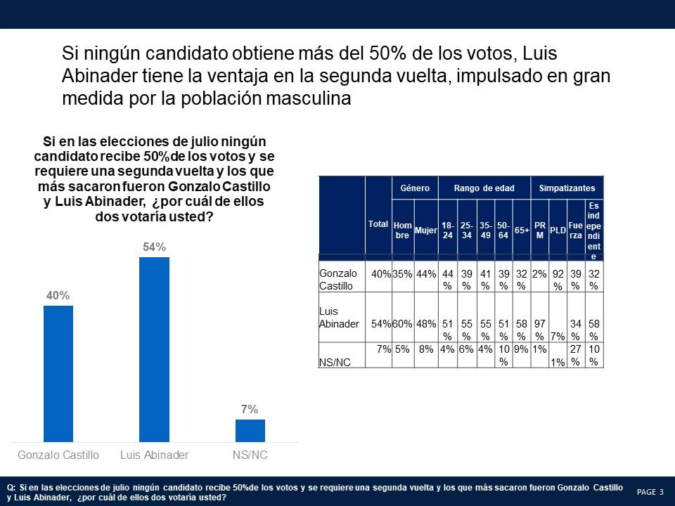 De ser necesaria una segunda vuelta Abinader ganaría 54% contra 40% por Castillo con un 7% de indecisos. Un alto 79% manifestó que tenía su voto decidido y que era muy difícil que lo cambiara antes de las elecciones. En las tres encuestas efectuadas por Mark Penn/Stagwell en enero, mayo y junio Luis Abinader estuvo encima tanto en la primera como en la segunda vuelta.