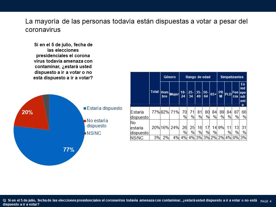 Un 72% de los encuestados indica que votaría, lo cual coincide con las estadísticas históricas dominicanas sobre absentismo. Cuando se preguntó si votaría a pesar de que el corona virus el 5 de julio todavía amenazara con contaminar, un 77% dijo que estaría dispuesto a ir a votar.