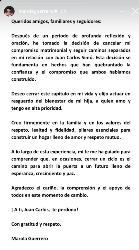 "Esta decisión se fundamenta en hechos que han quebrantado la confianza y el compromiso que ambos habíamos construido. Deseo cerrar este capítulo en mi vida y elijo actuar en resguardo del bienestar de mi hija, a quien amo y tengo en alta prioridad", manifestó Guerrero a través de un comunicado en su cuenta de Instagram.