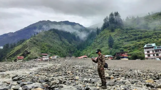 El pueblo de Dharali permanece cubierto por una espesa capa de barro y escombros, con viviendas sepultadas hasta el techo y calles intransitables. La Organización de Investigación Espacial de la India (ISRO) publicó imágenes del antes y el después de la aldea, que tiene ahora alrededor de 20 hectáreas sepultadas.