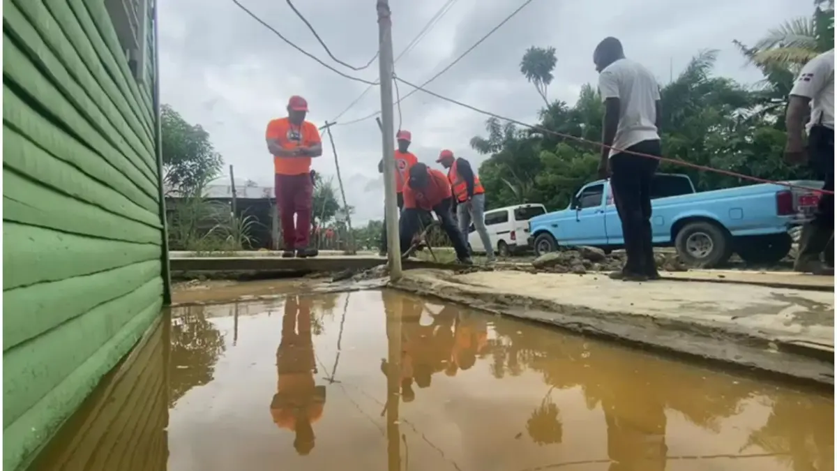 Los voluntarios de la Defensa Civil y Cruz Roja Dominicana trabajan en labores de desagüe y prevención.