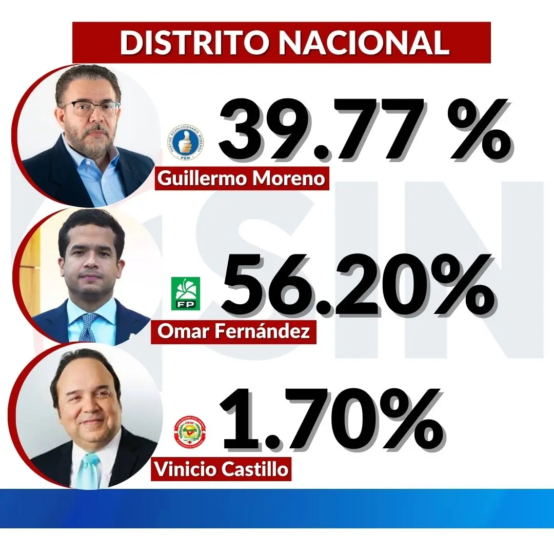 Los resultados electorales con el 99.78% de los colegios computados dan ganador a Omar Fernández, de la Fuerza del Pueblo y la Alianza Rescate RD con el 56.20%. Mientras que Guillermo Moreno obtuvo un 39.77%, muy por debajo a la media de los diputados del PRM en el Distrito Nacional.