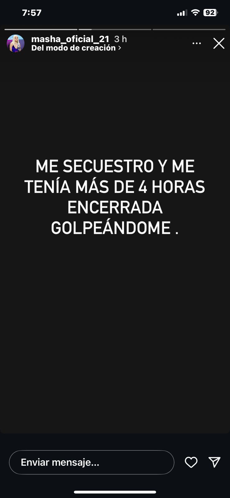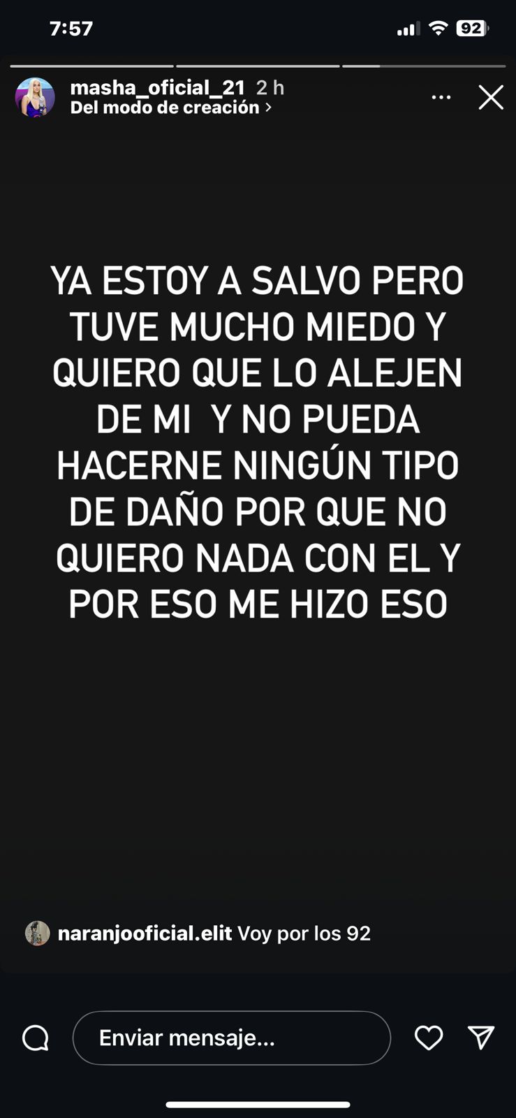 Masha hizo un llamado a la Policía Nacional debido a que su expareja tiene una orden de alejamiento por los abusos que en el pasado había sido sometida. "Él tiene querella y orden de alejamiento y sigue molestando", agregó.