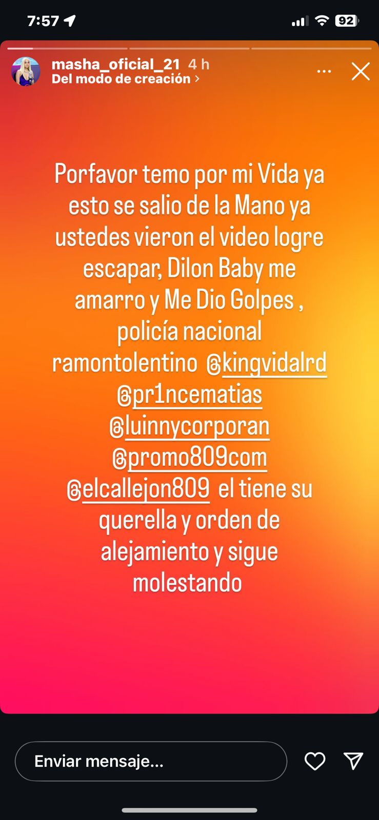 «Por favor temo por mi vida, ya esto se salió de la mano, ya ustedes vieron el video logré escapar, Dilon Baby me amarró y me dio golpes», publicó la joven en un story de Instagram.