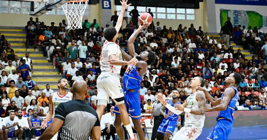Emmitt Williams, del club Mauricio Báez, en una ofensiva sobre JJ Romer, de Bameso.