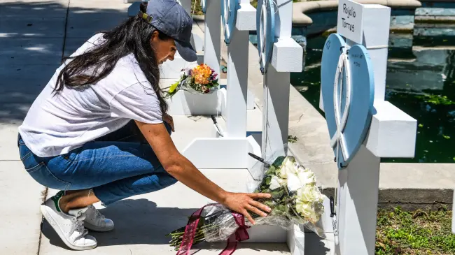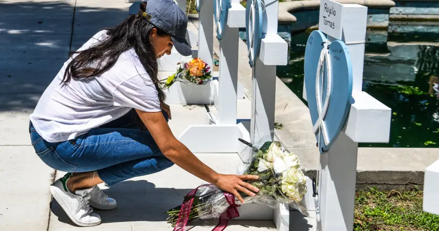 Markle, acompañada por un guardaespaldas, se acercó cabizbaja a una de las cruces con el nombre de uno de los niños muertos, Rogelio Torres, de 10 años, antes de agacharse para dejar el ramo.