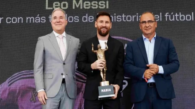 En la ceremonia de la entrega del premio, otorgado por el periódico deportivo Marca por ser el futbolista con más títulos de la historia del deporte, Messi también recibió un cuadro pintado por el artista barcelonés José María Peña Gallardo y una escultura del argentino Carlos Benavídez.
