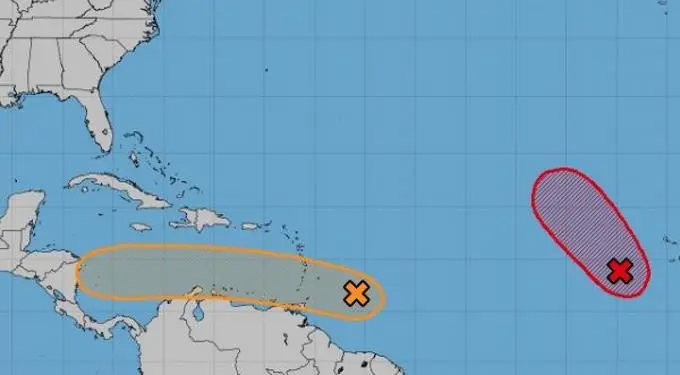 Miami.- Los meteorólogos del Centro Nacional de Huracanes (NHC) de Estados Unidos vigilan dos sistemas de baja presión en la cuenca atlántica, uno de los cuales podría llegar a ser una tormenta con nombre en los próximos días sobre el Caribe.