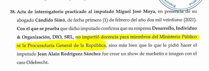 SANTO DOMINGO.- Según dice el expediente de solicitud de medida de coerción contra imputados en Operación Medusa, Miguel José de Moya admitió en el interrogatorio que no impartió docencia a miembros del Ministerio Público ni Procuraduría General de la República.