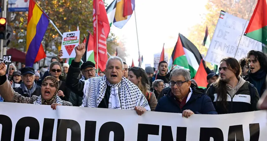 Después de 15 fines de semana de protestas descentralizadas en más de 100 municipios distintos del territorio nacional, este sábado la movilización se ha centralizado en Madrid para denunciar la responsabilidad del Gobierno español, de la Unión Europea, de los gobiernos autonómicos y nacionales, de los ayuntamientos y de las empresas que se lucran del "genocidio" en Gaza.