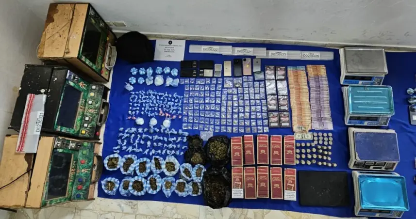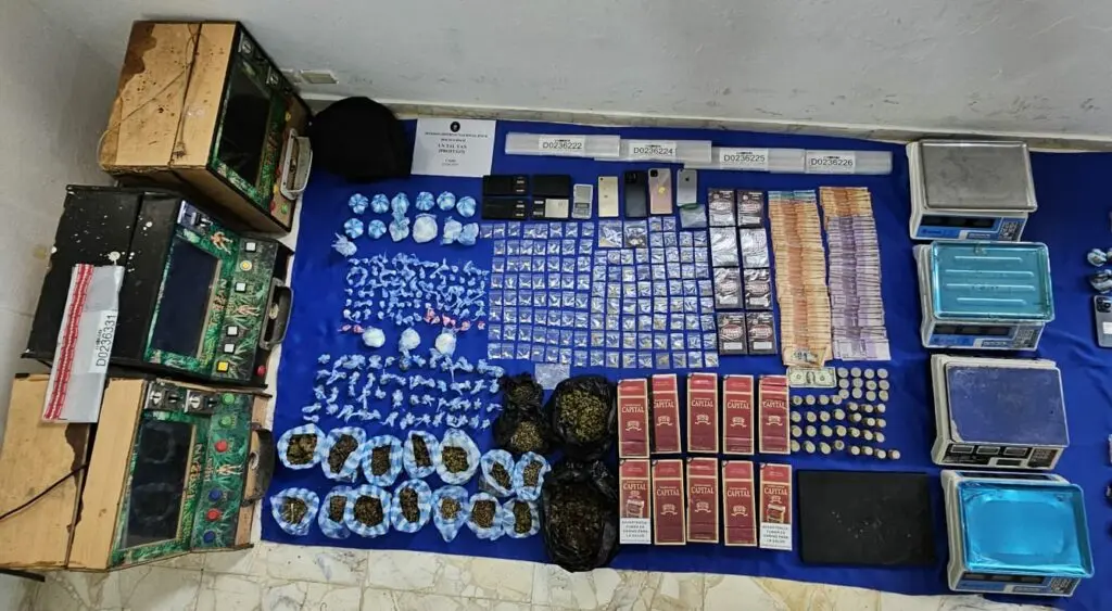 Además, las autoridades confiscaron 18 balanzas, 11 teléfonos celulares, 4 máquinas tragamonedas, varias cajas de cigarrillos, 2 computadoras portátiles, RD$34,170 pesos dominicanos, un dólar estadounidense y otros objetos vinculados al tráfico de drogas.