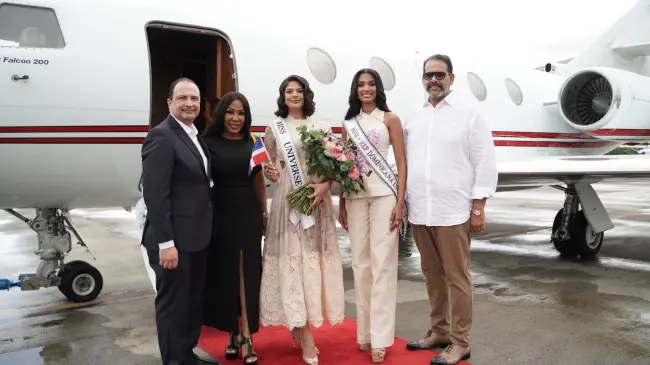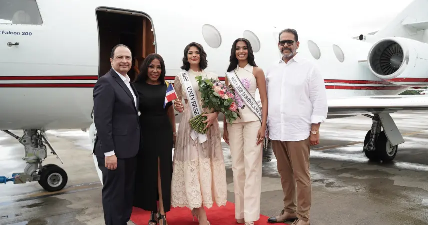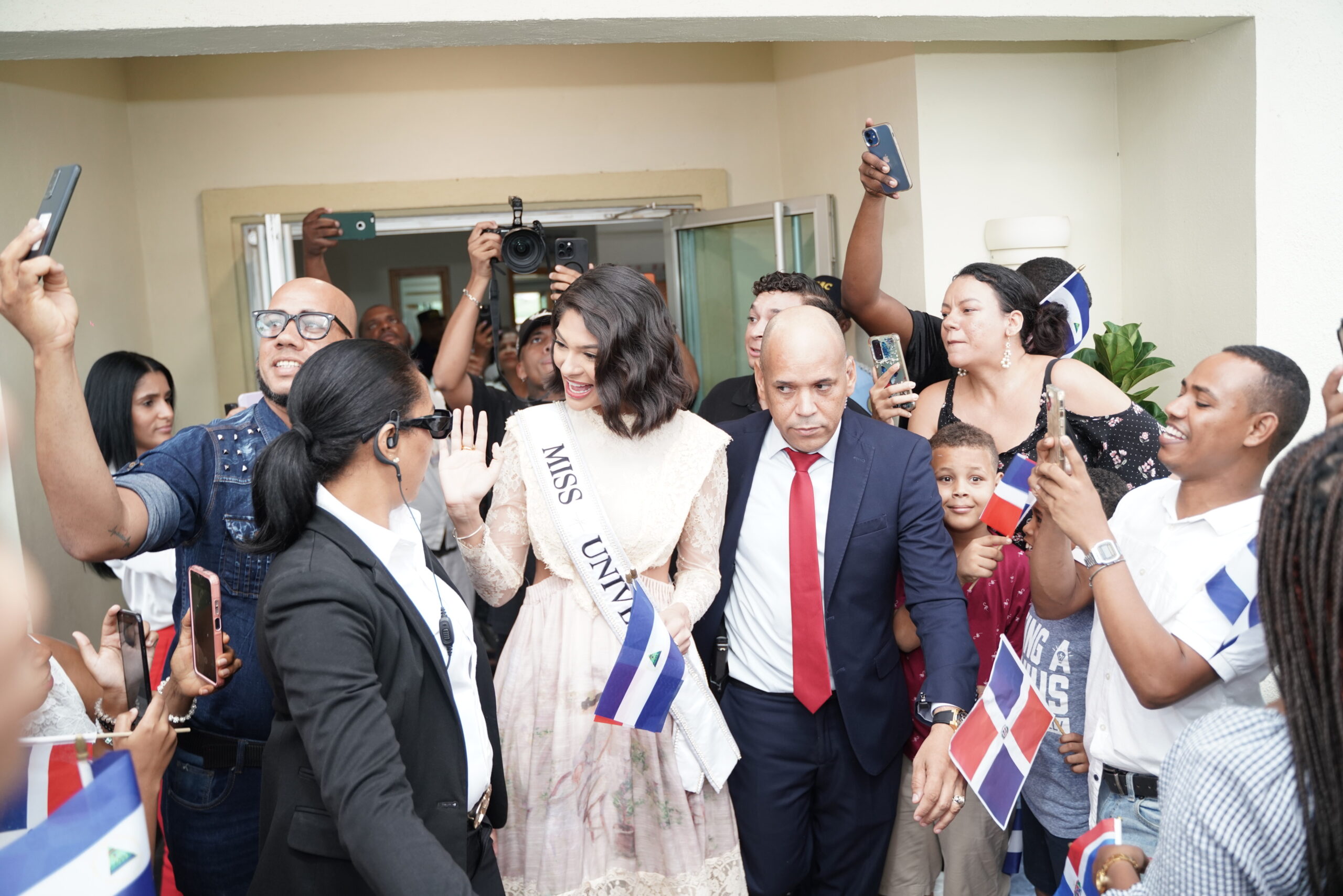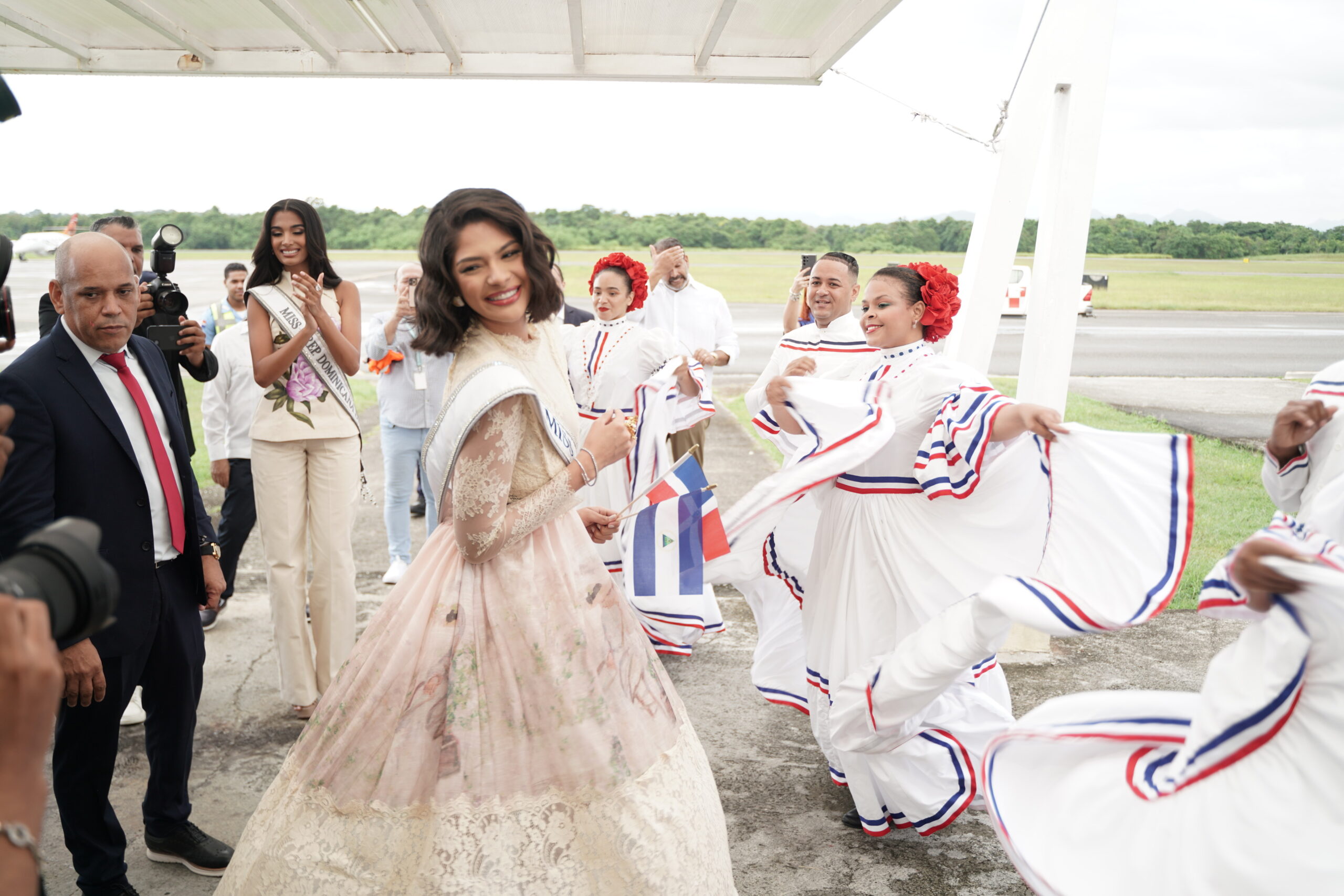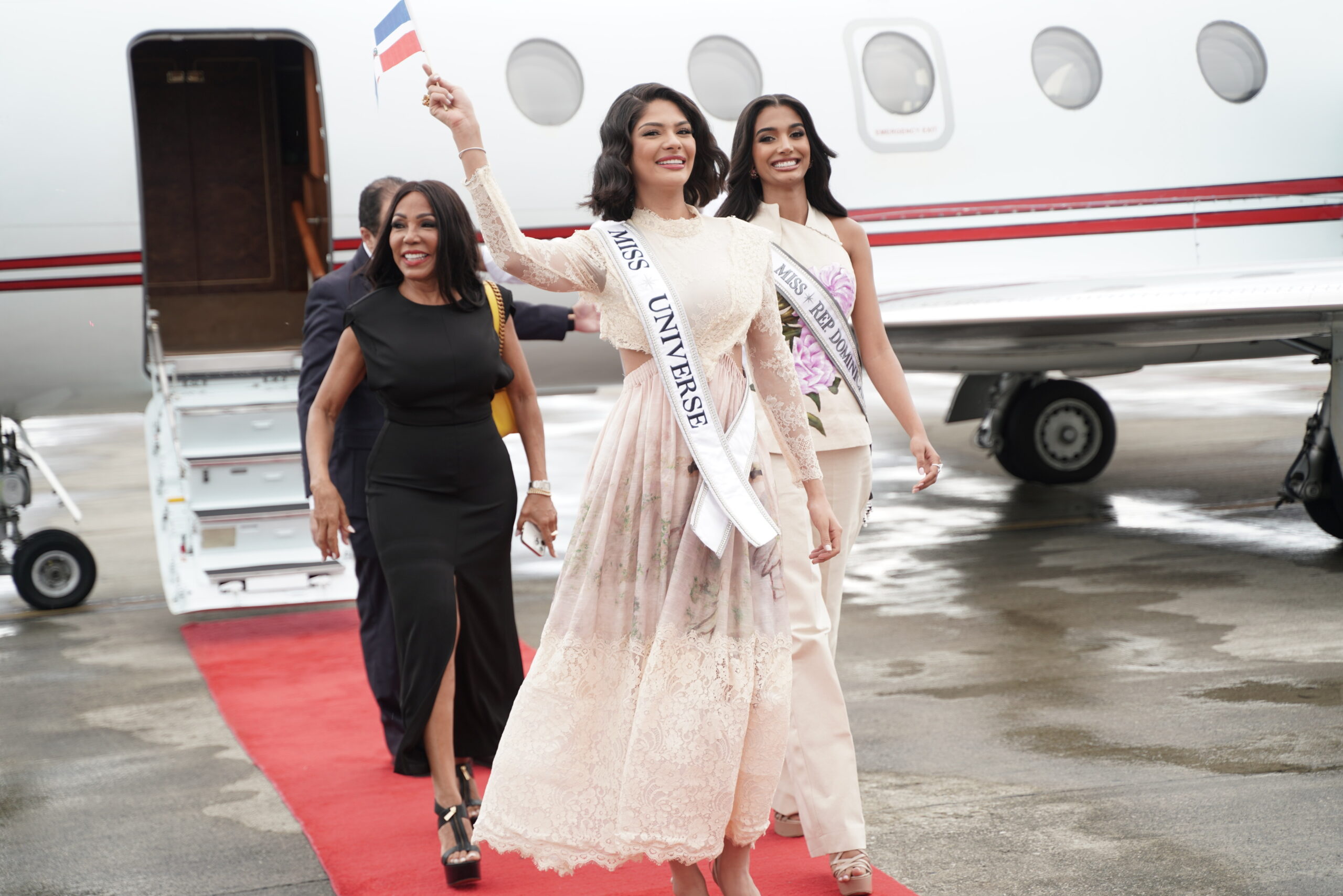 Santo Domingo.– SANTO DOMINGO.- Miss Universo 2023, Sheynnis Palacios, llegó a suelo dominicano en un Jet privado de Sky Holding, por el Aeropuerto Internacional Joaquín Balaguer, procedente de Puerto Rico, en compañía de una comitiva especial de la Organización De Miss Universe, quienes fueron recibidos por sus anfitrionas, Magalis Febles y la actual Miss República Dominicana Universo, Celinee Santos, así como el C.E.O de Sky Holding, Frank Diaz en un recibimiento con el Ballet Folklorico y los fanáticos que se acercaron al recibimiento con banderas.