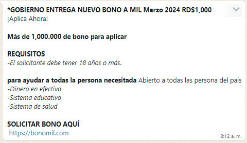 SANTO DOMINGO -.– SANTO DOMINGO. - Un modelo de estafa está circulando en la red social de WhatsApp, usurpando las funciones de instituciones del Gobierno invita a los usuarios a aplicar para la entrega de un “bono a mil marzo 2024”.