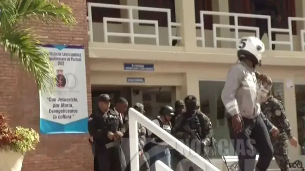 Cruz salió de la Iglesia con casco protector, chaleco antibalas, rodeado por agentes SWAT y acompañado por la procuradora adjunta Yenny Berenice Reynoso, así como el director de la Policía Nacional, el mayor general Eduardo Alberto Then.