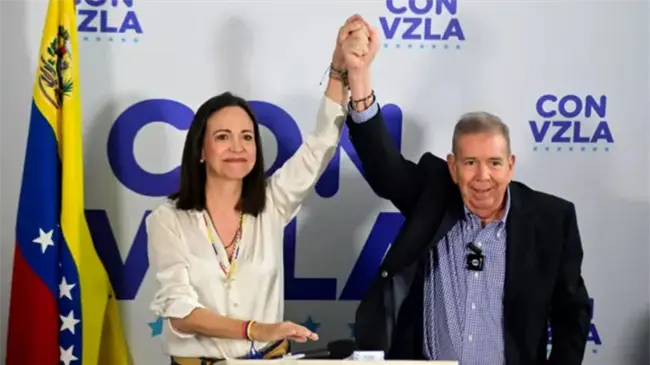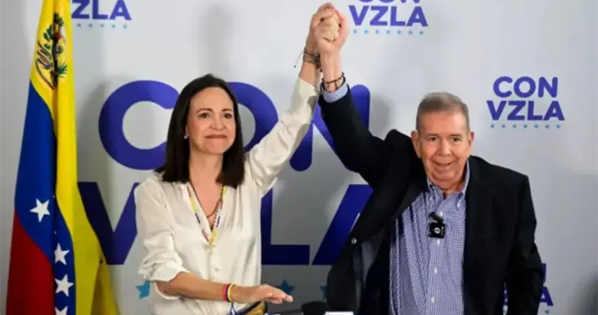 Bogotá.– La foto que muestra a los opositores venezolanos María Corina Machado y Edmundo González Urrutia saludando desde el balcón del Grand Hotel en Oslo es un montaje. Usuarios en redes sociales compartieron esta imagen, que fue manipulada a partir de una fotografía original tomada en una rueda de prensa en Caracas.