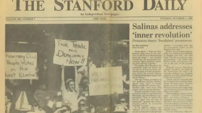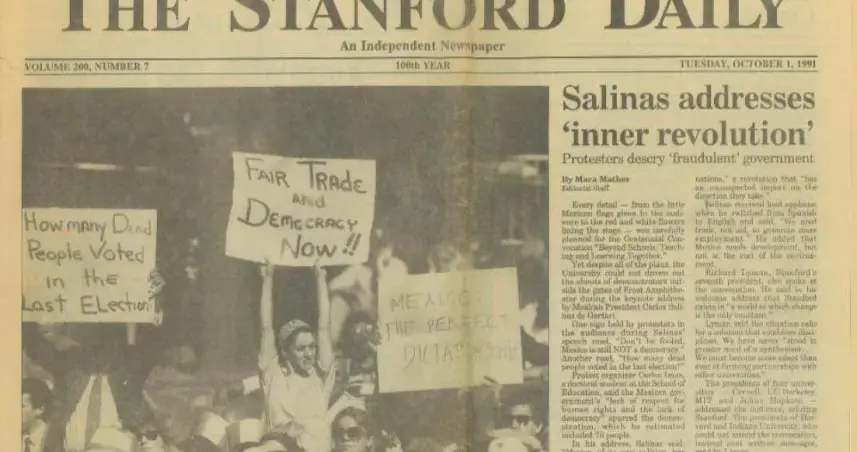 Redacción.- En la portada del periódico The Stanford Daily, de 1991, aparece la actual presidenta del gobierno mexicano, Claudia Sheinbaum, levantando una cartulina con la frase “Comercio justo y democracia ahora”. En la imagen, la actual mandataria protesta en contra del Tratado de Libre Comercio (TLC) en Stanford, California.