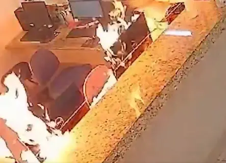 En un video que circula en redes sociales se puede ver cuando la mujer, fuera de sí, rocía un líquido sobre el mostrador, y luego lanza un fósforo.
