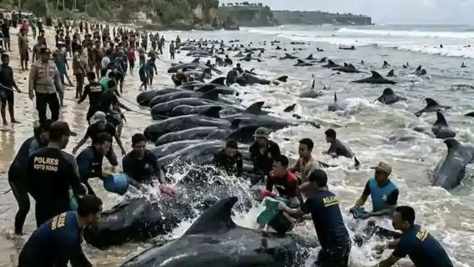 De las 55 ballenas varadas, 21 murieron, incluyendo cuatro crías. Los equipos de rescate guiaron a 34 de vuelta al mar.