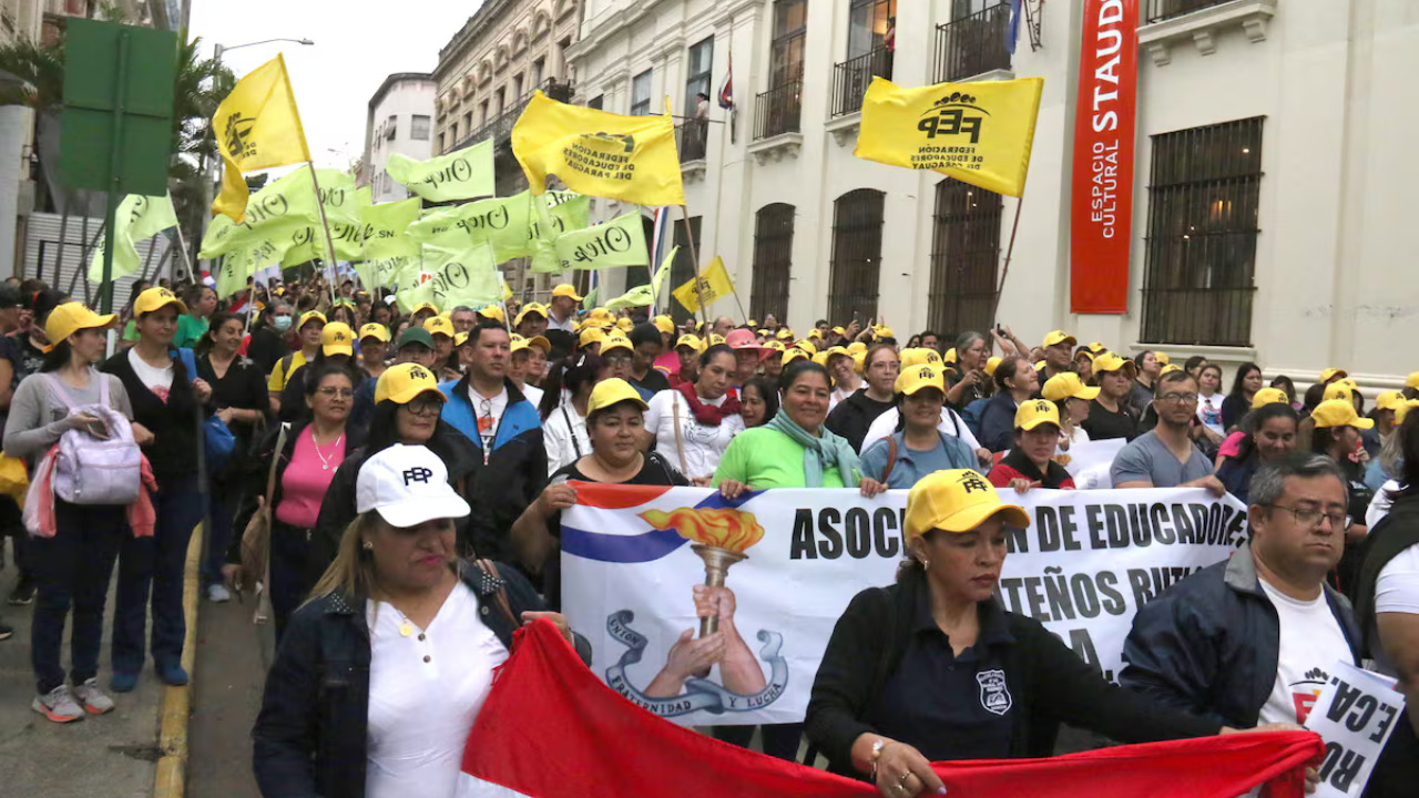 Cientos de docentes marcharon este martes por las calles de Asunción, la capital de Paraguay, y otras ciudades del país, para defender el sistema de jubilaciones y pensiones del sector público ante un proyecto gubernamental que esta semana busca reformar en el Congreso la ley vigente.
