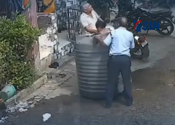 India.- Un video increíble circula en las redes. Se trata de mujer en la India que tuvo la suerte extraordinaria de sobrevivir cuando le cayó encima un tanque de agua, tipo tinaco mientras caminaba. La dama quedó exactamente en un hueco del tinaco, y salió de allí sin un rasguño, para sorpresa de familiares y vecinos que acudieron a auxiliarla.