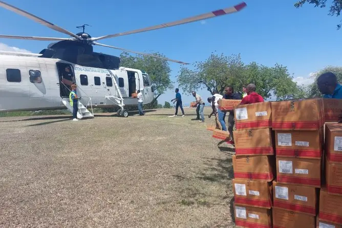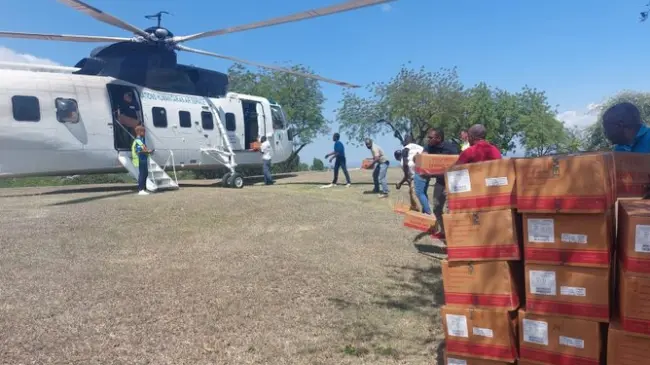 En las imágenes colocadas con el mensaje, se visualiza un helicóptero con varias personas descargando las cajas con los suministros para Haití.