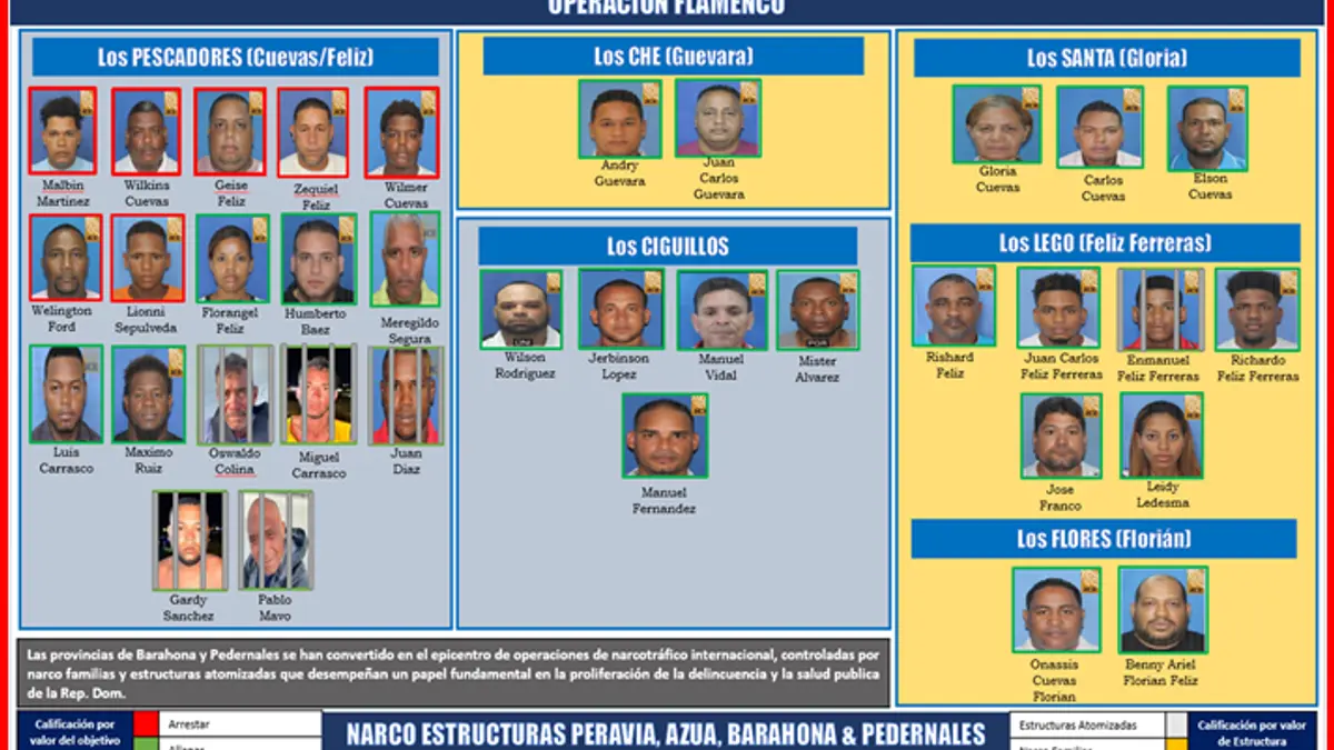 El Ministerio Público indica que los organismos de seguridad del Estado Dominicano representados por la Dirección Nacional de Control de Drogas (DNCD) y la Administración de Control de Drogas (DEA), en coordinación con la Dirección General del Ministerio Público en el desarrollo de la presente investigación de orden público, logró visibilizar e individualizar seis estructuras de criminalidad organizada de primer orden, dedicadas a la transportación, logísticas de gestión, organización y ejecución de operaciones de narcotráfico transnacional vía marítima, logrando movilizar por separado desde el mes de diciembre del año 2021, aproximadamente veintiocho (28) toneladas de cocaína al año, traduciéndose esto en la movilización de miles de millones de dólares a favor de las inversiones en narcóticos por parte de grandes narcotraficantes "capos de drogas", quienes depositan su confianza en estas seis (6) organizaciones integradas por las treinta y siete 37 personas investigadas para llevar a cabo sus operaciones de narcotráfico transnacional en conjunto, siendo sus funciones principales planificar, trasportar y ejecutar dichas operaciones de narcotráfico desde Suramérica hacia la República Dominicana, bajo la modalidad de enviar dichas lanchas a territorio colombiano y luego regresar con los kilos de narcóticos hacia Santo Domingo, principalmente la zona sur del país, específicamente en las provincias de Peravia, Barahona y Pedernales para luego ser enviadas hacia los Estados Unidos de América, Puerto Rico y Europa.