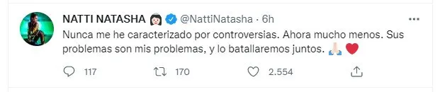 “Nunca me he caracterizado por controversias. Ahora mucho menos. Sus problemas son mis problemas, y lo batallaremos juntos”, escribió la urbana en su cuenta de Twitter.